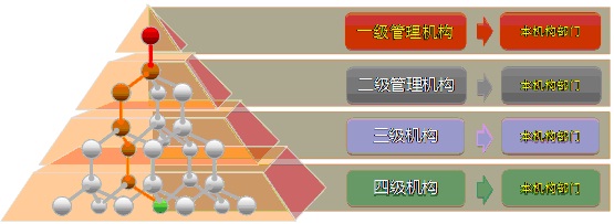 对于大多数大中型集团公司的组织机构体系,都是由集团(公司)总部、各省分公司、各地区支公司以及基层营销服务部组成的金字塔形组织架构(如下图)。其中:集团(公司)总部为一级机构、各省分公司为二级机构、各地区支公司为三级机构、基层营销服务部为四级机构。每一级机构基本都拥有本机构所属的下属部门。